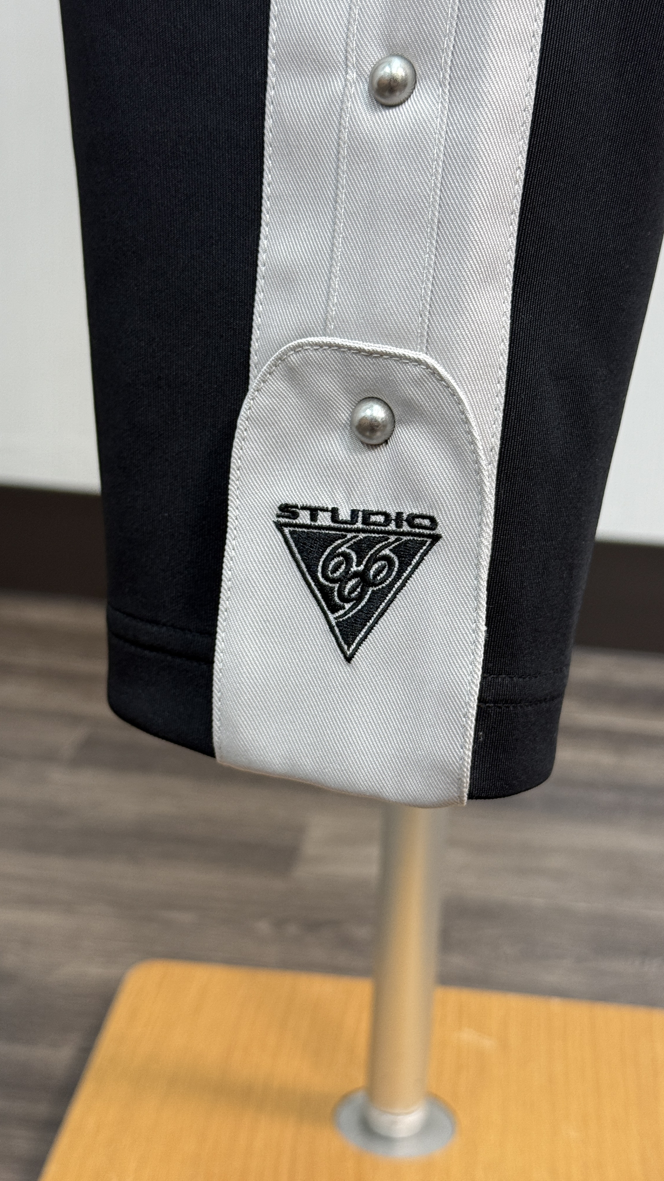 アクセントとしてラインにはリベットをイメージした丸のスタッズを、裾にはSTUDIO696のロゴを刺繍しています。